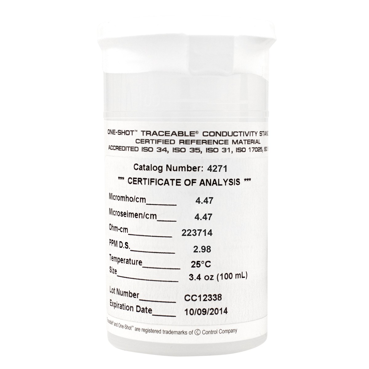 - Cada botella se suministra con instrucciones de calibración paso a paso, tabla de compensación de temperatura individual, información de trazabilidad y Certificado Traceable® .