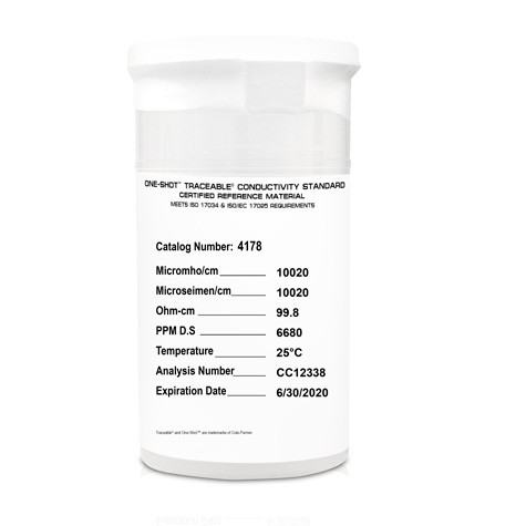 - Cada contenedor se suministra con instrucciones de calibración paso a paso, tabla de compensación de temperatura individual, información de trazabilidad y Certificado Traceable® . Se suministra como un paquete de seis. Cada One-Shot™ contiene 100 mililitros.