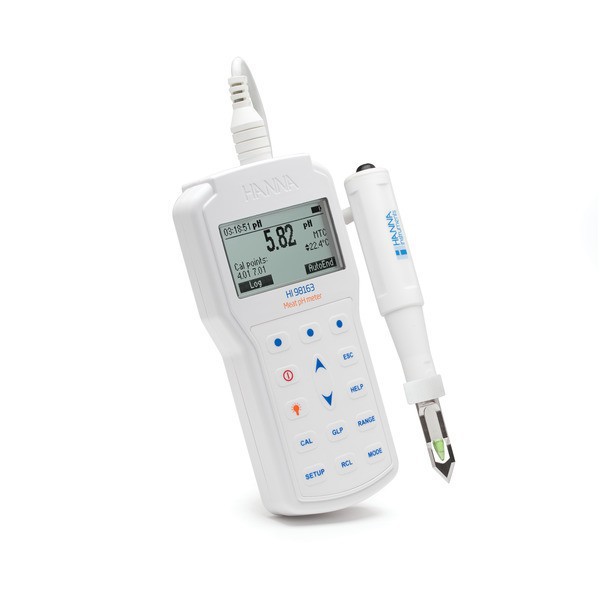 - Además tiene un electrodo de pH exclusivo para la carne , el sistema HI908163 tiene la característica exclusiva de CAL Check ™ de Hanna que alerta al usuario de posibles problemas durante el proceso de calibración. Esto es muy importante en el sector alimentario ya que es probable que la sonda se obstruya con los sólidos que se encuentran en el producto que se está midiendo. Esta obstrucción puede conducir fácilmente a errores en la medición del pH. Al comparar los datos de calibración con la calibración actual, el medidor de información personal, con indicaciones en pantalla, cuando la sonda necesita limpieza, reemplazo o si la solución de pH puede estar contaminada.Después de la calibración, el estado general de la sonda se muestra en la pantalla como un porcentaje del 0 al 100% en incrementos del 10%. El estado de la sonda se ha visto afectado por las características de desplazamiento y pendiente del electrodo de pH.